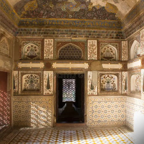 The walls of the tomb have fine carvings of flowers, patterns, and colorful stones. Sunlight makes the artwork shine and enhances the delicate designs. The monument is surrounded by a peaceful Mughal garden with walkways and water channels.